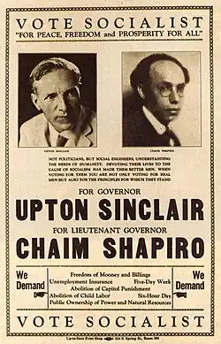 Socialist Party campaign poster featuring Sinclair and Chaim Shapiro as candidates for Governor and Lieutenant Governor of California, respectively, 1930