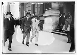 Upton Sinclair wearing a white suit and black armband, picketing the Rockefeller Building in New York City