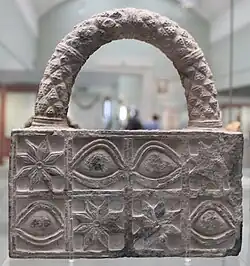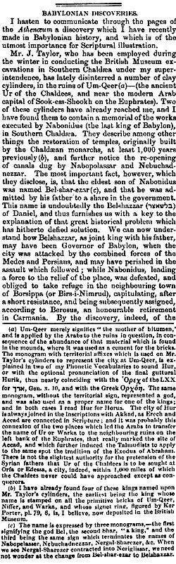 The site was first excavated, on behalf of the British Museum and with instructions from the Foreign Office, by John George Taylor, British vice consul at Basra in 1853, 1854, and again in 1858.[34][35][36] It had long been thought that Taylor only worked at the site in 1853 and 1854 but a 48 page handwritten report of his work there in 1858 has now come to light. Finds from the dig included a carved stone with integral handle, a plaque with woman's face, and a foundation cone of A'annepada.[37] Taylor uncovered the Ziggurat of Ur and a structure with an arch later identified as part of the "Gate of Judgment".[38] Among the finds were copies of a standard cylinder of Nabonidus, Neo-Babylonian ruler, mentioning the prince regent Belshar-uzur, usually thought to be the Belshazzar of the Book of Daniel in the Hebrew Bible.[39] Between 1854 and 1918 locals excavated over two hundred tablets from the site, mostly from the temple ร-nun-maแธซ, of the moon god Sin.[40] Built by the Ur III ruler Ur-Nammu, the ziggurat was later repaired by Isin ruler Ishme-Dagan early in the 2nd millennium BC.[25]:โ88-124โ Stamped bricks on the ziggurat detail the rebuilding of the temple of Ningal by 14th century BC Kassite ruler Kurigalzu I.[41]