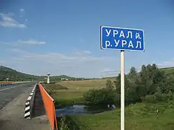 The entire length of the Ural River is considered the Europe-Asia boundary by most authoritative sources.[23][24][25] Rarely, the smaller, shorter Emba River is claimed as the continental boundary,[26][27] but that pushes "Europe" much further into "Central Asian" Kazakhstan. The Ural River bridge in Orenburg is even labeled with permanent monuments carved with the word "Europe" on one side, "Asia" on the other.[28] Regardless, Kazakhstan has some European territory and is at times included in European political and sports organizations.[29][30]