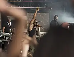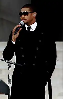 Here I Stand was released on May 26 in the United Kingdom and May 27, 2008, in the United States. The album debuted at No. 1 on the Billboard 200 Chart with first-week sales of over 433,000 copies.[69] To date Here I Stand has sold over 1.5 million copies in the United States,[70] received a double platinum certification from the RIAA,[71] and has sold over 5 million copies worldwide.[72] While not approaching the success of his previous album, it received positive reviews from most music critics, who praised the maturity in the album's lyrics. To promote Usher's fifth studio album, the single "Love In This Club" was sent to radio in February 2008 and peaked at number one on the Billboard Hot 100. It went on to spend three consecutive weeks at the top—becoming Usher's eighth number-one single and the fastest-rising song of his career.[69][73] It also reached No. 1 on the Hot R&B/Hip-Hop Songs chart. The single was another huge international success for Usher. It reached No. 1 on the New Zealand Singles Chart, No. 3 on the Irish Singles Chart, No. 3 on the Eurochart Hot 100, No. 4 on the UK Singles Chart, No. 5 on the Japan Hot 100, No. 5 on the German Singles Chart, No. 5 on the Belgian Singles Chart (Flanders), No. 6 on the Canadian Hot 100, No. 8 on the Swedish Singles Chart, No. 8 on the Australian Singles Chart, No. 9 on the French Singles Chart, No. 9 on the Swiss Singles Chart, No. 10 on the Norwegian Singles Chart, No. 12 on the Austrian Singles Chart, No. 13 on the Belgian Singles Chart (Wallonia), and No. 18 on the Finnish Singles Chart. The follow-up single "Love in This Club Part II", which features American singer Beyoncé and rapper Lil Wayne, peaked at No. 18 on the Billboard Hot 100 and No. 7 on the Hot R&B/Hip-Hop Songs chart. Its third single "Moving Mountains" peaked at No. 18 on the Hot R&B/Hip-Hop Songs chart and reached No. 6 on the New Zealand Singles Chart. The album's fifth single "Trading Places" peaked at No. 4 on the Hot R&B/Hip-Hop Songs chart.[32] In September 2008, Usher announced he would embark on the 15-date tour One Night Stand, in which the audience is only females.[74] On January 18, 2009, Usher performed with Stevie Wonder and Shakira at the We Are One: The Obama Inaugural Celebration at the Lincoln Memorial. He also sang "Gone Too Soon" at the memorial of Michael Jackson on July 7, 2009.[75]
