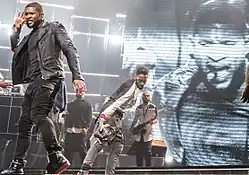 Usher's stage performances have been complimented by critics as "packed with high-octane choreography held together by sleek, masterful showmanship",[241] and his presence "engaging enough to pull off a one-man show".[229][242] Vibe magazine notes him as being Bobby Brown-esque for his displays of "brash sexuality and arrogance",[243] leading to antics such as being "prone to dropping his pants",[244] and a "tendency to shed his shirt on stage",[245] while John Aizlewood of The Guardian observed that "For all his pelvic thrusting and crotch-grabbing, Usher is a rather courtly presence."[246] On his 8701 Evolution Tour in 2002, Larry Nager of The Cincinnati Enquirer hailed his simultaneous ability, stating "the 23-year-old Atlantan proved you can sing and dance at the same time. Of course, that's how James Brown, Jackie Wilson and Usher's most obvious role model Michael Jackson did it, but in today's high-tech, gimmicky concerts, it's a lost art", claiming his show "ended the reign of 'Nsync, Britney and the rest of the lip-synching, teen-pop acts".[247] Usher told People magazine "James Brown introduced me to soul. Because of him I was given a clear view of what a real performance is and should be. I learned showmanship from him",[248] and has seen comparisons to his influences.[242] At the 2004 MTV Video Music Awards, he performed "Confessions Part II" and "Yeah!" under a rain machine, in which he eventually threw the mic stand at a mirror during the former. Rolling Stone placed it at number 13 of their "20 Best MTV VMAs Opening Performances".[249]