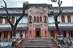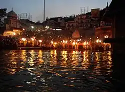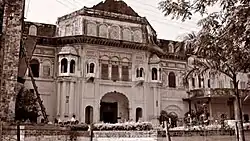 By 1803 the Landhaura villages numbered 794 under Raja Ram Dayal Singh. Raja Ram Dayal Singh died on 29 March 1813.[39] These holdings, at least those in the original grant made by the Rohilla governor, were initially recognised by the British in land settlements concluded with Ram Dayal and his heirs. As the years passed, more and more settlements appear to have been made with the village communities, however, and by 1850 little remained of the once vast estate of the Landhaura Khübars.[40] There are many temples and Ghats on Ganga built by Rajas of Landhaura estate, therefore they also famous as ' Haridwari Rajas' in folk history and literature. Famous Dakshamahadev Temple at Kankhal was built by Queen DhanKaur of Landhaura in 1810 A.D.[41]