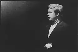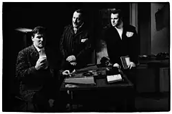 The intellectual tradition of his family was essential for Havel's lifetime adherence to the humanitarian values of the Czech culture.[12] After finishing his military service (1957–59), Havel had to bring his intellectual ambitions in line with the given circumstances, especially with the restrictions imposed on him as a descendant of a bourgeois family. He found employment in Prague's theatre world as a stagehand at Prague's Theatre ABC – Divadlo ABC, and then at the Theatre on Balustrade – Divadlo Na zábradlí. Simultaneously, he was a student of dramatic arts by correspondence at the Theatre Faculty of the Academy of Performing Arts in Prague (DAMU). His first own full-length play performed in public, besides various vaudeville collaborations, was The Garden Party (1963). Presented in a series of Theatre of the Absurd, at the Theatre on Balustrade, this play won him international acclaim. The play was soon followed by The Memorandum, one of his best known plays, and The Increased Difficulty of Concentration, all at the Theatre on Balustrade. In 1968, The Memorandum was also brought to The Public Theater in New York, which helped to establish Havel's reputation in the United States. The Public Theater continued to produce his plays in the following years. After 1968, Havel's plays were banned from the theatre world in his own country, and he was unable to leave Czechoslovakia to see any foreign performances of his works.[13]