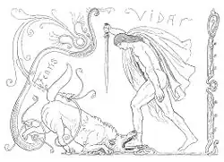 In chapter 51, High foretells that, during Ragnarök, the wolf Fenrir will devour Odin, and Víðarr will avenge him by stepping down with one foot on the lower jaw of the monster, grabbing his upper jaw in one hand and tearing his mouth apart, killing him. Víðarr's "thick shoe" is described as consisting of all the extra leather pieces that people have cut from their own shoes at the toe and heel, collected by the god throughout all time. Therefore, anyone who is concerned enough to give assistance to the gods should throw these pieces away.[7] According to some mythologists, he owed this peculiar footgear to his mother Grid, who, knowing that he would be called upon to fight against fire on the last day, designed it as a protection against the fiery element, as her iron gauntlet had shielded Thor in his encounter with Geirrod.[8]