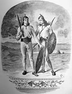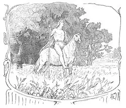 According to Skáldskaparmál, Víðarr was one of the twelve presiding male gods seated in their thrones at a banquet for the visiting Ægir.[10] At a point in dialogue between the skaldic god Bragi and Ægir, Snorri himself begins speaking of the myths in euhemeristic terms and states that the historical equivalent of Víðarr was the Trojan hero Aeneas who survived the Trojan War and went on to achieve "great deeds".[11]