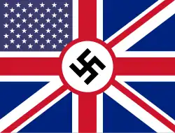 Film critics, political commentators and other members of the media have also noted the film's numerous references to events surrounding the George W. Bush administration in the United States. These include the hoods and sacks worn by the prisoners in Larkhill that have been seen as a reference to the Abu Ghraib torture and prisoner abuse.[20][21] The Homeland Security Advisory System and rendition are also referenced.[22] One of the forbidden items in Gordon's secret basement is a protest poster with a mixed US–UK flag with a swastika and the title "Coalition of the Willing, To Power" which combines the "Coalition of the willing" with Friedrich Nietzsche's concept of will to power.[23]