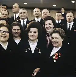 According to the Russian newspaper Pravda, one million flowers were brought in to celebrate the success of the dual flights and greet the cosmonauts in Moscow.[44] On 22 June 1963, Khrushchev greeted Bykovsky dressed in his uniform who saluted while Khrushchev hugged and kissed Tereshkova who was dressed in civilian attire. In front of the thousands in attendance, the Premier also announced that both the cosmonauts were awarded the Hero of the Soviet Union medal. All three made speeches from atop Lenin's Tomb on the Red Square; Tereshkova said, "my father perished defending our country and my mother brought up her three children. We know the bitterness of that war. We don't need war," referring to the anniversary of the German invasion of Russia that began 22 years ago that day.[45] Sometime after her mission, she was reportedly asked how the Soviet Union should thank her for her service to the country; Tereshkova requested that the government search for and publish the location of where her father was killed in action. This was done, and a monument was erected at the site in the Lemetti, Karelia—now on the Russian side of the border.[2] The evening of 22 June, a reception was held in the Kremlin in which both Bykovsky and Tereshkova were awarded the Order of Lenin.[45]