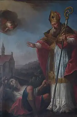 The same events are found in Bede's Martyrology, which was compiled in the 8th century.[31][32] It states that Saint Valentine was persecuted as a Christian and interrogated by Roman Emperor Claudius II in person. Claudius was impressed by Valentine and had a discussion with him, attempting to get him to convert to Roman paganism in order to save his life. Valentine refused and tried to convert Claudius to Christianity instead. Because of this, he was executed. Before his execution, he is reported to have performed a miracle by healing Julia, the blind daughter of his jailer Asterius. The jailer's daughter and his forty-six member household, family members and servants, came to believe in Jesus and were baptized.[33][31]