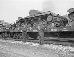 The War Office was initially deterred by the size of the turret, since they considered a turret crew of three necessary, to free the vehicle commander from direct involvement in operating the gun.[10] Concerned by the situation in Europe, it finally approved the design in April 1939 and placed the first order in July for deliveries in May 1940. At the start of the war, Vickers were instructed to give priority to the production of tanks.[11] The vehicle reached trials in May 1940, which coincided with the loss of much of the army's equipment in France, during Operation Dynamo, the evacuation from Dunkirk. The trials were successful and the vehicle was rushed into production as "Tank, Infantry, Mark III"; no pilot models were required as much of the mechanics had been proven on the A10,[12] and 109 had been built by the end of September.[13] During late 1940 and early 1941, Valentines were used in the cruiser tank role in British-based armoured divisions, and they were supplied to tank brigades of the Eighth Army in North Africa from June 1941.[14]