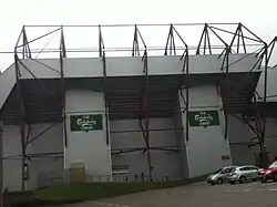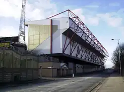 The Valley Parade stadium is divided into five all-seater stands, the JCT600 Stand, the Kop, the Midland Road Stand, the North West Corner and the TL Dallas Stand.[2][48] All five stands, except for a small part of the main stand, are covered[49] and all but the Midland Road Stand are two-tiered. Most of the stands are cantilever structures, and because of the ground's location on the hillside, the Midland Road Stand overhangs the road.[50][51]