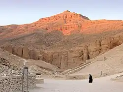 The Theban Hills are dominated by the peak of al-Qurn, known to the Ancient Egyptians as ta dehent, or "The Peak".[21] It has a pyramid-shaped appearance, and it is probable that this echoed the pyramids of the Old Kingdom, more than a thousand years prior to the first royal burials carved here.[22][23] Its isolated position also resulted in reduced access, and special tomb police (the Medjay) were able to guard the necropolis.[24]