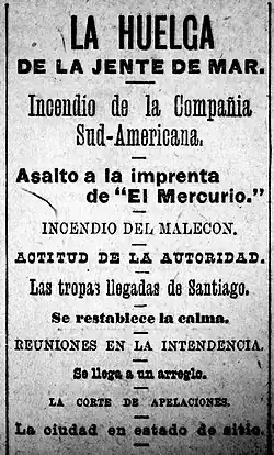 The Strike of the Seafarers. Fire of the South American Company. Assault on the printing press of El Mercurio. Fire of the Malecon. Attitude of the Authority. The troops arrived from Santiago. The calm is restored. Meetings in the Municipality. It reaches an Arrangement. The Court of Appeals. The city in State of Siege.