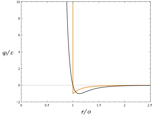 Figure B: The Sutherland potential (orange) represents two hard spheres that attract according to an inverse power law, and the Lennard-Jones potential (black) represents the induced-dipole–induced-dipole interaction of two non-polar molecules. Both are simple realistic molecular models.[11]