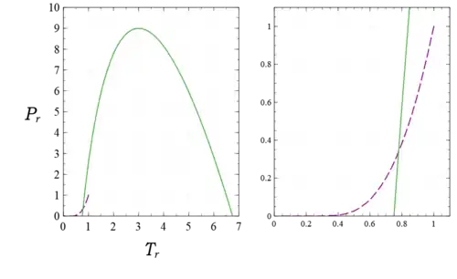 The parameter is given physically by . This solution also produces values of all other property discontinuities across the saturation curve.[69] These functions define the coexistence curve (or saturation curve), which is the locus of the saturated liquid and saturated vapor states of the vdW fluid. Projections of this saturation curve are plotted in Figures 1 and 2.