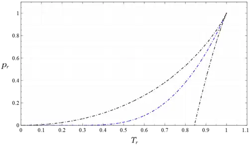 The idea of corresponding states originated when Van der Waals cast his equation in the dimensionless form, . However, as Boltzmann noted, such a simple representation could not correctly describe all substances. Indeed, the saturation analysis of this form produces ; namely, that all substances have the same dimensionless coexistence curve, which is not true.[74] To avoid this paradox, an extended principle of corresponding states has been suggested in which where is a substance-dependent dimensionless parameter related to the only physical feature associated with an individual substance: its critical point.