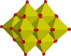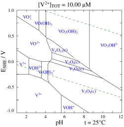 In an aqueous solution, vanadium(V) forms an extensive family of oxyanions as established by 51V NMR spectroscopy.[25] The interrelationships in this family are described by the predominance diagram, which shows at least 11 species, depending on pH and concentration.[28] The tetrahedral orthovanadate ion, VO3−