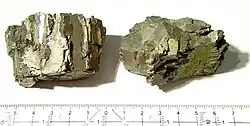 Vanadium began to be used in the manufacture of special steels in 1896. At that time, very few deposits of vanadium ores were known. Between 1899 and 1906, the main deposits exploited were the mines of Santa Marta de los Barros (Badajoz), Spain. Vanadinite was extracted from these mines.[53] At the beginning of the 20th century, a large deposit of vanadium ore was discovered near Junín, Cerro de Pasco, Peru (now the Minas Ragra vanadium mine).[54][55][56] For several years this patrónite (VS4)[57] deposit was an economically significant source for vanadium ore. In 1920 roughly two-thirds of the worldwide production was supplied by the mine in Peru.[58] With the production of uranium in the 1910s and 1920s from carnotite (K2(UO2)2(VO4)2·3H2O) vanadium became available as a side product of uranium production. Vanadinite (Pb5(VO4)3Cl) and other vanadium bearing minerals are only mined in exceptional cases. With the rising demand, much of the world's vanadium production is now sourced from vanadium-bearing magnetite found in ultramafic gabbro bodies. If this titanomagnetite is used to produce iron, most of the vanadium goes to the slag and is extracted from it.[59][56]