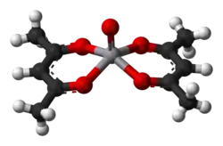 Complexes of vanadium(II) and (III) are reducing, while those of V(IV) and V(V) are oxidants. The vanadium ion is rather large and some complexes achieve coordination numbers greater than 6, as is the case in [V(CN)7]4−. Oxovanadium(V) also forms 7 coordinate coordination complexes with tetradentate ligands and peroxides and these complexes are used for oxidative brominations and thioether oxidations. The coordination chemistry of V4+ is dominated by the vanadyl center, VO2+, which binds four other ligands strongly and one weakly (the one trans to the vanadyl center). An example is vanadyl acetylacetonate (V(O)(O2C5H7)2). In this complex, the vanadium is 5-coordinate, distorted square pyramidal, meaning that a sixth ligand, such as pyridine, may be attached, though the association constant of this process is small. Many 5-coordinate vanadyl complexes have a trigonal bipyramidal geometry, such as VOCl2(NMe3)2.[45] The coordination chemistry of V5+ is dominated by the relatively stable dioxovanadium coordination complexes[46] which are often formed by aerial oxidation of the vanadium(IV) precursors indicating the stability of the +5 oxidation state and ease of interconversion between the +4 and +5 states.[47]