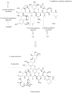 - ^ a b c van Wageningen AM, Kirkpatrick PN, Williams DH, Harris BR, Kershaw JK, Lennard NJ, et al. (March 1998). "Sequencing and analysis of genes involved in the biosynthesis of a vancomycin group antibiotic". Chemistry & Biology. 5 (3): 155–62. doi:10.1016/S1074-5521(98)90060-6. PMID 9545426.