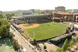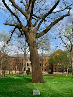 The oldest part of the Vanderbilt campus is known for its abundance of trees and green space, which stand in contrast to the surrounding cityscape of urban Nashville.[155] The campus was designated as a national arboretum in 1988 by the Association of Botanical Gardens and Arboreta, and in 2020 it was accredited as a Level II arboretum by ArbNet.[156] Approximately 190 species of trees and shrubs can be found on campus.[155] One tree, the Bicentennial Oak between Rand Hall and Garland Hall, was certified to have lived during the American Revolution and was the oldest living thing on the campus.[155] The Bicentennial Oak succumbed to age-related decay and fell on November 12, 2022.[157] In December 2015, a hackberry tree fell, leaving 10 students injured with "broken bones and stitches."[158][159] Additionally, in August 2022, a tree fell on Peabody Lawn, leaving two students injured.[160]