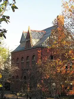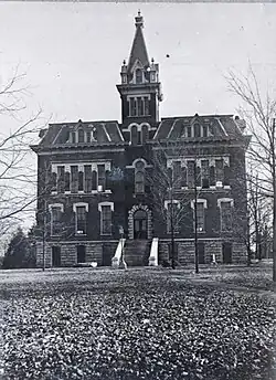 The first building, Main Building, later known as Kirkland Hall, was designed by William Crawford Smith, and its construction began in 1874.[23][24] In the fall of 1875, about 200 students enrolled at Vanderbilt, and in October the university was dedicated.[15] Bishop McTyeire was named chairman of the Board of Trust for life by Vanderbilt as a stipulation of his endowment.[15] McTyeire named Landon Garland (1810–1895), his mentor from Randolph-Macon College, as chancellor. Garland shaped the school's structure and hired the school's faculty.[20] Most of this faculty left after disputes with Bishop McTyeire, including over pay rates.[15] When the first fraternity chapter, Phi Delta Theta, was established on campus in 1876, it was shut down by the faculty, only to be reestablished as a secret society in 1877.[25] In 1880, Old Gym, a Victorian building designed by Peter J. Williamson, was completed and became the university's first gymnasium.[24] By 1883, the Board of Trust passed a resolution allowing fraternities on campus, and more chapters were established in 1884.[25]