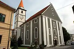 Varaždin was declared a free royal borough in 1209 by the Hungarian King Andrew II. The town became the economic and military centre of northern Croatia. Due to Ottoman raids, the town was structured defensively around the old fortress, and acquired the shape of a typical medieval Wasserburg. In the early 13th century, the Knights Hospitaller (Croatian: Ivanovci) came to Varaždin, where they built the church and a monastery.[8] Mid 13th century, the church of St. John belonging to the Hospitallers was taken over by Franciscans, who extended it over several centuries, eventually replacing the medieval structures with early baroque.[9]