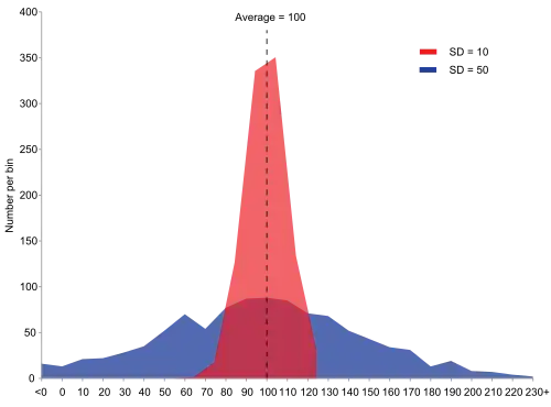 In probability theory and statistics, variance is the expected value of the squared deviation from the mean of a random variable. The standard deviation is obtained as the square root of the variance. Variance is a measure of dispersion, meaning it is a measure of how far a set of numbers are spread out from their average value. It is the second central moment of a distribution, and the covariance of the random variable with itself, and it is often represented by , , , , or .[1]