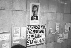 The State's reaction to the strikes demonstrated that while global isolation produced pressures for political, social, and economic change, the events that followed could not be predetermined. Hardly anyone thought that the Communist State could collapse so quickly. Striking students and theatres did not seem likely to intimidate a state that was able to suppress any sort of demonstration. This "popular" phase of the revolution, was followed by victories made possible by the Civic Forum's successful mobilisation for the general strike on 27 November, which established its legitimacy to speak for the nation in negotiations with the state.[9] The mass demonstrations that followed 17 November led to the resignation of the Party leadership of Miloš Jakeš, the removal of the Party from its leading role and the creation of the non-Communist government. Supporters of the revolution had to take instant responsibility for running the government, in addition to establishing essential reforms in political organisation and values, economic structure and policies and foreign policy.[25]