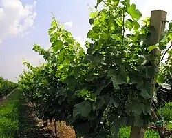 Prosecco is a dry sparkling wine.[75][76] It is made from the glera grape, a white grape formerly known as Prosecco,[77] which is traditionally grown in an area near Conegliano and Valdobbiadene, in the hills north of Treviso.[75] The name of Prosecco is derived from the northern Italian village of Prosecco (Trieste), where this grape variety is believed to have originated.[76][78]