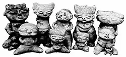 It is estimated that one million people lived in the region before Spanish conquest.[57] In addition to indigenous peoples known today, the population included groups such as the Kalina (Caribs), Auaké, Caquetio, Mariche, and Timoto–Cuicas. The Timoto–Cuica culture was the most complex society, with planned permanent villages surrounded by irrigated, terraced fields.[58] Houses were made of stone and wood with thatched roofs. They were peaceful and depended on growing crops. Regional crops included potatoes and ullucos.[59] They left behind art, particularly anthropomorphic ceramics, but no major monuments. They spun vegetable fibers to weave into textiles and mats for housing. They are credited with having invented the arepa, a staple in Venezuelan cuisine.[60]