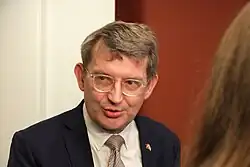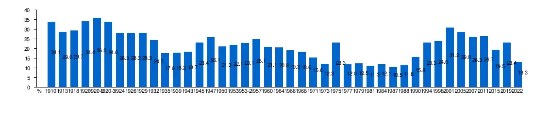 Venstre is the major party of the centre-right in Denmark, and the second-largest party in the country. The party has produced many Prime Ministers. In the 2022 general elections, Venstre received 13.3% of the vote and 23 out of 179 seats. Following the resignation of Jakob Ellemann-Jensen, the party is led by Troels Lund Poulsen who serves as the country's Deputy Prime Minister.[15] Since December 2022, the party has been a junior partner in the second Frederiksen government.