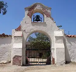 In 1769, the Spanish Portolà expedition, first recorded European visitors to inland areas of California, came down the Santa Clara River Valley from the previous night's encampment near today's Saticoy and camped near the outlet of the Ventura River on August 14. Fray Juan Crespi, a Franciscan missionary traveling with the expedition, noted that "we saw a regular town, the most populous and best laid-out of all that we had seen on the journey up to the present time."[20] Archaeological records found that the Chumash village they encountered was settled sometime around AD 1000. Junípero Serra, first leader of the Franciscans in California, founded Mission San Buenaventura in 1782 as his ninth and last mission established near the Chumash village as part of Spain's colonization of Alta California.[21] The mission was named for St. Bonaventure, a 13th-century Franciscan saint and a Doctor of the Church. San Miguel Chapel was the first outpost and center of operations while the first Mission San Buenaventura was being constructed. The first mission burned in 1801 and a replacement building of brick and stone was completed in 1809. The bell tower and facade of the new mission was destroyed by an 1812 earthquake.[22][23] The Mission was rebuilt and functions as a parish church.
