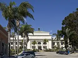The large Ventura Oil Field was first drilled in 1919 and at its peak produced 90,000 barrels per day (14,000 m3/d).[31][32] The development of the oil fields in the 1920s, along with the building of better roads to Los Angeles and the affordability of automobiles, enabled a major real estate boom. Symphony concerts and Little League teams were sponsored by the oil companies.[33] Contemporary downtown Ventura is defined by extant buildings from this period.[34][35] Landmarks built during the oil boom include Ventura Theatre (1928), the First Baptist Church of Ventura (1926), the Ventura Hotel (1926), and the Mission Theatre (1928).[36][34]