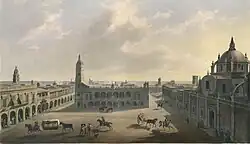 Veracruz was the most important port in New Spain, with a large wealthy merchant class that was more prosperous than that of Mexico City.[8] Each of the two yearly voyages of the Spanish treasure fleet to and from Spain were to gather at Veracruz stevedores, muleteers, navigators, sailors, contractors, merchants and civil servants. In 1568 the Armada admiral Francisco Luján successfully ambushed a fleet of British privateers led by John Hawkins and Francis Drake whilst they were provisioning at Veracruz. By the end of the 16th century, the Spanish had constructed roads to link Veracruz with other cities such as Córdoba, Orizaba, Puebla, Xalapa and Perote. Their gold and silver were the principal exports.[13][14]