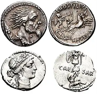 Vercingetorix on Roman coinage (dated 48 BC) - Top: bust right (war chariot on reverse); bottom: tied near war trophy (female head on obverse)