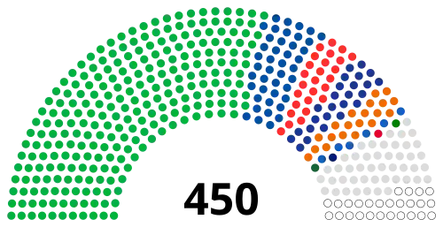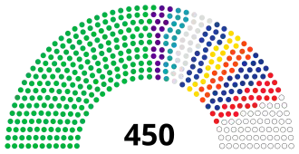 | Due to the war in Donbas and the annexation of Crimea by the Russian Federation, only 424 of the parliament's 450 seats were elected in the 2019 election, leaving 26 vacant. The number of vacant seats had grown to 27 as of June 2020.[8][9][10][11] | |