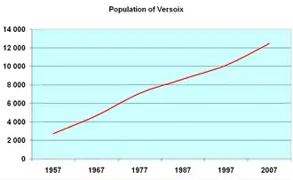 Versoix has a population (as of December 2020) of 13,281.[5] As of 2008, 41.7% of the population are resident foreign nationals.[6] Over the last 10 years (1999–2009) the population has changed at a rate of 23.3%. It has changed at a rate of 19% due to migration and at a rate of 5.8% due to births and deaths.[7]