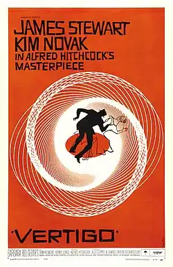 Graphic designer Saul Bass used spiral motifs in both the title sequence and the movie poster, emphasizing what the documentary Obsessed with Vertigo calls the film's "psychological vortex".[23] Bass's unconventional framing of actress Audrey Lowell's facial features in the first images of the titles was indebted to Bauhaus photography. According to her 1997 Guardian interview, Kim Novak wanted to do the opening title sequence but Harry Cohn insisted Hitchcock pay full rate for the single day's shooting and so another face was chosen.[61]