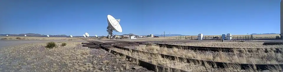 The Karl G. Jansky Very Large Array (VLA) is a centimeter-wavelength radio astronomy observatory in the southwestern United States built in the 1970s. It lies in central New Mexico on the Plains of San Agustin, between the towns of Magdalena and Datil, approximately 50 miles (80 km) west of Socorro. The VLA comprises 28 25-meter (82 ft) radio telescopes (27 of which are operational while one is always rotating through maintenance) deployed in a Y-shaped array and all the equipment, instrumentation, and computing power to function as an interferometer. Each of the massive telescopes is mounted on double parallel railroad tracks, so the radius and density of the array can be transformed to adjust the balance between its angular resolution and its surface brightness sensitivity.[2] Astronomers using the VLA have made key observations of black holes and protoplanetary disks around young stars, discovered magnetic filaments and traced complex gas motions at the Milky Way's center, probed the Universe's cosmological parameters, and provided new knowledge about the physical mechanisms that produce radio emission.