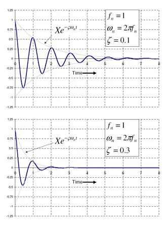 The plots to the side present how 0.1 and 0.3 damping ratios effect how the system "rings" down over time. What is often done in practice is to experimentally measure the free vibration after an impact (for example by a hammer) and then determine the natural frequency of the system by measuring the rate of oscillation, as well as the damping ratio by measuring the rate of decay. The natural frequency and damping ratio are not only important in free vibration, but also characterize how a system behaves under forced vibration.