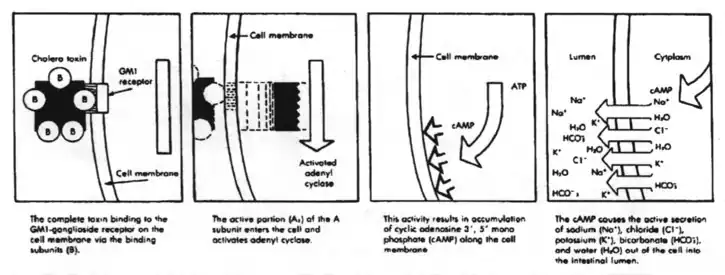 During infection, V. cholerae secretes cholera toxin (CT), a protein that causes profuse, watery diarrhea (known as "rice-water stool").[33][5] This cholera toxin contains 5 B subunits that plays a role in attaching to the intestinal epithelial cells and 1 A subunit that plays a role in toxin activity. Colonization of the small intestine also requires the toxin coregulated pilus (TCP), a thin, flexible, filamentous appendage on the surface of bacterial cells. Expression of both CT and TCP is mediated by two component systems (TCS), which typically consist of a membrane-bound histidine kinase and an intracellular response element.[34] TCS enable bacteria to respond to changing environments.[34] In V. cholerae several TCS have been identified to be important in colonization, biofilm production and virulence.[34] Quorum regulatory small RNAs (Qrr RNA) have been identified as targets of V. cholerae TCS.[34][35][36] Here, the small RNA (sRNA) molecules bind to mRNA to block translation or induce degradation of inhibitors of expression of virulence or colonization genes.[34][35] In V. cholerae the TCS EnvZ/OmpR alters gene expression via the sRNA coaR in response to changes in osmolarity and pH. An important target of coaR is tcpI, which negatively regulates expression of the major subunit of the TCP encoding gene (tcpA). When tcpI is bound by coaR it is no longer able to repress expression tcpA, leading to an increased colonization ability.[34] Expression of coaR is upregulated by EnvZ/OmpR at a pH of 6,5, which is the normal pH of the intestinal lumen, but is low at higher pH values.[34] V. cholerae in the intestinal lumen utilizes the TCP to attach to the intestinal mucosa, not invading the mucosa.[34] After doing so it secretes cholerae toxin causing its symptoms. This then increases cyclic AMP or cAMP by binding (cholerae toxin) to adenylyl cyclase activating the GS pathway which leads to efflux of water and sodium into the intestinal lumen causing watery stools or rice watery stools.
