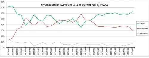 When Fox took office on 1 December 2000, his approval rating neared 80%. During the rest of his presidency, his average approval rating was of 53%, while his average disapproval rating was of 40%.