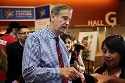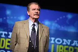 Vicente Fox Quesada (Latin American Spanish: [biˈsente ˈfoks keˈsaða]; born 2 July 1942) is a Mexican businessman and politician who served as the 62nd president of Mexico from 2000 to 2006. After campaigning as a right-wing populist,[1][2][3][4] Fox was elected president on the National Action Party (PAN) ticket in the 2000 election. He became the first president not from the Institutional Revolutionary Party (PRI) since 1929, and the first elected from an opposition party since Francisco I. Madero in 1911. Fox won the election with 43 percent of the vote.[5] Considered a social-welfare promoter, along with Julio Frenk Mora, he formulated, signed and implemented the Seguro Popular which helped circa 55 million independent workers.[6]