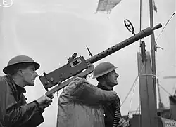 The Gun, Machine, Vickers, .5-inch, Mk. III was used as an anti-aircraft gun on British ships.[21] This variation was typically four guns mounted on a 360° rotating and (+80° to −10°) elevating housing. The belts were rolled into a spiral and placed in hoppers beside each gun. The heavy plain bullet weighed 1.3 oz (37 g) and was effective for the 1,500 yd (1,400 m) range. The maximum rate of fire for the Mark III was about 700 rpm from a 200-round belt carried in a drum. They were fitted from the 1920s onwards, but in practical terms, they proved of little use. During the Second World War, the naval 0.5-inch (12.7 mm) version was also mounted on power-operated turrets in smaller watercraft, such as Motor Gun Boats and Motor Torpedo Boats.