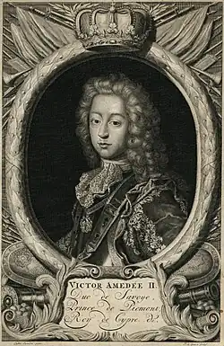 Victor Amadeus II (Italian: Vittorio Amedeo Francesco, Arpitan: Victor-Amèdê, French: Victor-Amédée; 14 May 1666[1] – 31 October 1732) was the head of the House of Savoy and ruler of the Savoyard states from 12 June 1675 until his abdication in 1730. He was the first of his house to acquire a royal crown, ruling first as King of Sicily (1713–1720) and then as King of Sardinia (1720–1730). Among his other titles were Duke of Savoy, Duke of Montferrat, Prince of Piedmont, Marquis of Saluzzo and Duke of Aosta, Maurienne and Nice.