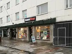 The industry's shift from brick and mortar retail to digital downloads led to a severe sales decline at video game retailers such as GameStop, following other media retailers superseded by Internet delivery, such as Blockbuster, Tower Records, and Virgin Megastores. GameStop diversified its services by purchasing chains that repair wireless devices and expanding its trade-in program through which customers trade used games for credit towards new games.[77] The company began to produce its own merchandise and games. In Britain, the games retailer Game revamped its stores so customers would spend time playing games there. It built a gaming arena for events and tournaments.[78] The shift to digital marketplaces, especially for smartphones, led to an influx of inexpensive and disposable games,[79] and lower engagement among gamers who otherwise purchased new games from retail.[80] Customers also shifted away from the tradition of buying games on their first day of release.[81]