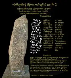 Ban Tha Lat, Mon inscription (9th CE), was found in 1968, in an area where other pieces of archaeological evidence testified to a Mon presence. It was exhibited at Ho Phra Keo Museum, Vientiane, Laos[8][9]