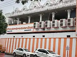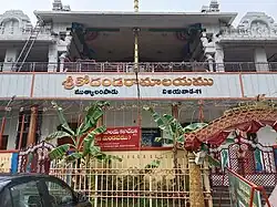 Vijayawada is considered to be a sacred place due to it being home to one of the most visited and famous temples in Andhra Pradesh and India, the Kanaka Durga Temple of the Hindu Goddess Durga residing on the Indrakeeladri hill.[15] It also serves as the ritual host of Pushkaram (a river worshipping ritual in India) of the River Krishna.[16] There is a legend which says that Arjuna, one of the heroes of the Indian epic Mahabharata, prayed on top of the Indrakeeladri Hill in the city and won the blessings of the Lord Shiva to get the Pashupatastra to win the Kurukshetra War.[17] It was called Vijayavatika (meaning Land of Victory in Telugu) when Goddess Durga killed the demon Mahishasura and rested on the Indrakeeladri Hill by the River Krishna establishing the victory over evil hence the place got its name Vijayavatika, "Vijaya" meaning victory, and "Vatika" meaning place or land in Telugu.[18]