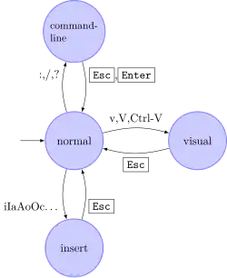 Like vi, Vim supports multiple editing modes. Depending on the mode, entered characters are either processed as command input or inserted as text. Vim has 14 modes (7 basic modes and 7 variants):[26]